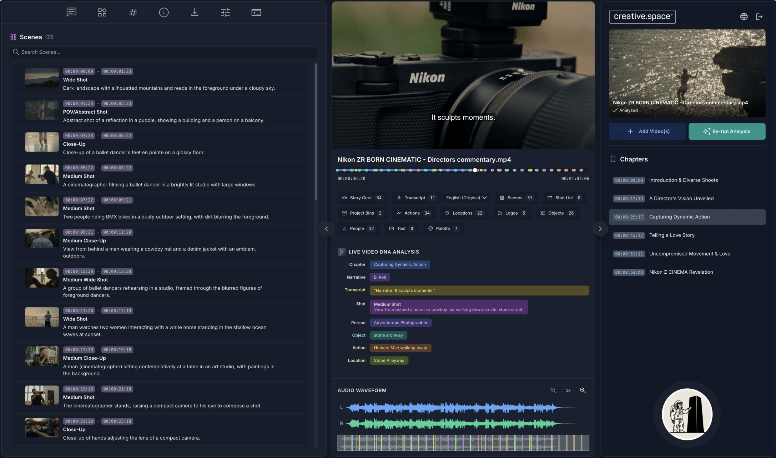 “Most AI tools just point out objects in a video (a car, a person, a tree). creative.space Intelligence (CSI) does something much more valuable: it tells you why your video matters, how it makes the audience feel, and how to repeat that success.”