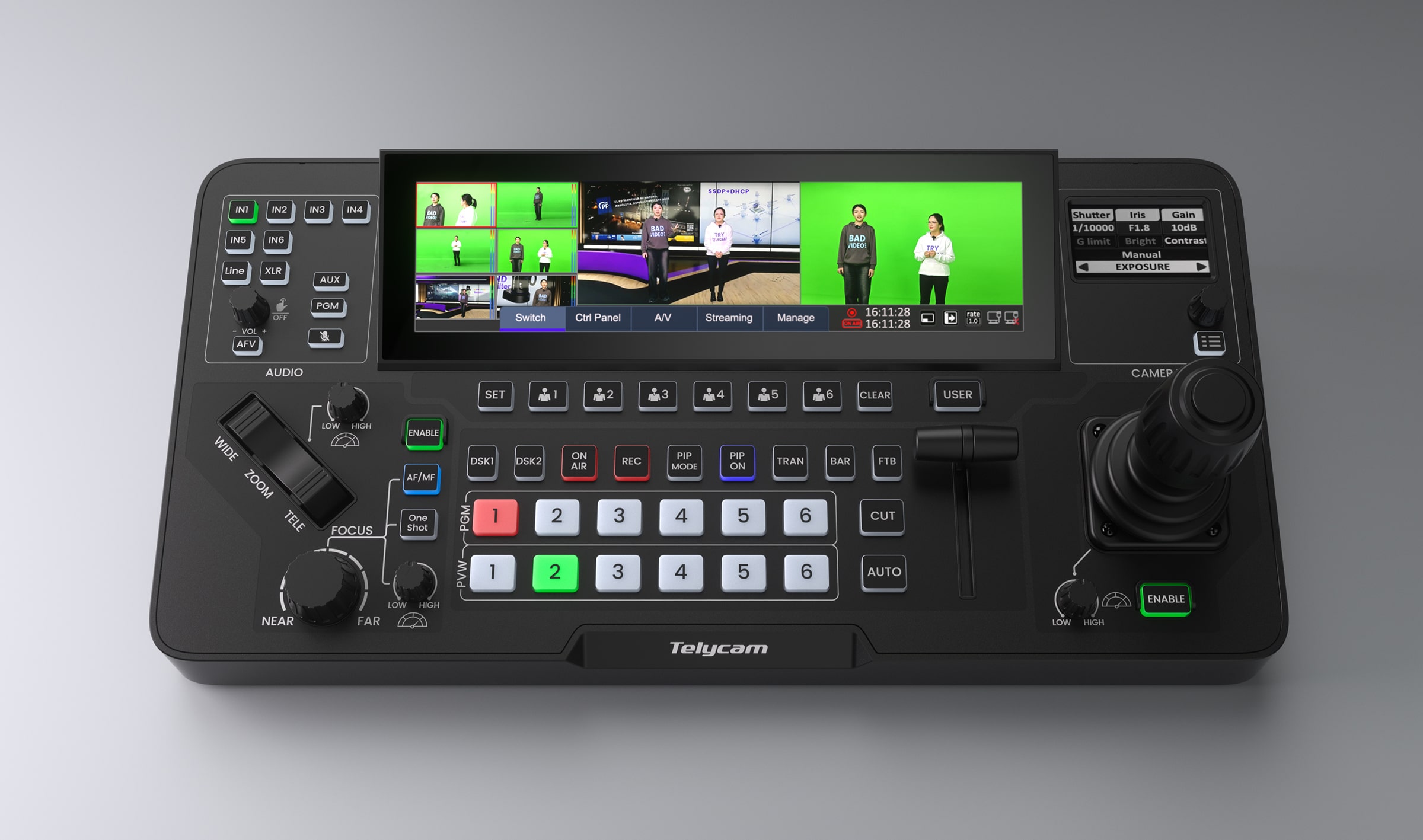Designed specifically for PTZ users, Mix One communicates directly with PTZ cameras via VISCA, VISCA over IP, NDI, and serial protocols for smooth, responsive control. A hall-effect joystick delivers precise, butter-smooth camera movement for live operation. Image parameters such as exposure, color, white balance, and detail can be adjusted directly from the switcher interface—no need to jump between camera menus or web pages.